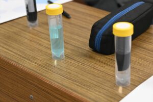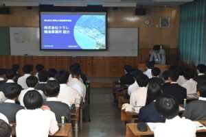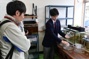 出前授業では、1・2年生を対象に、会社の事業概要や研究内容についてご説明いただき、さらに脱色実験も実施していただきました。その後、3年生の課題研究班がアクアポニックス設備の案内と提供サンプルの比較試験方法について打ち合わせを行いました。