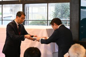 生徒会による開式あいさつ、校長挨拶、来賓紹介の後、日軽形材株式会社 佐々木社長よりご挨拶と事業紹介があり、目録贈呈が行われました。続いて、生徒会長が感謝の言葉を述べ、企業・大学の来賓の方々から温かい励ましのメッセージをいただきました。
