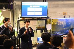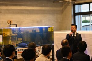 その後、化学研究部とコンピュータ部の生徒が研究プレゼンテーションを行い、本校の取り組みや成果を紹介しました。式の終盤には水槽の除幕式を実施し、新設備のお披露目に会場は大いに盛り上がりました。