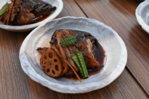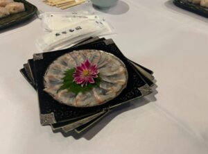 最後に記念写真を撮影し、遊食房屋様のご協力によるタマカイの試食会と歓談の時間が設けられました。初めて口にするタマカイの味に、生徒・教職員からは驚きと感動の声が上がりました。