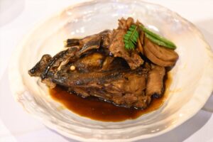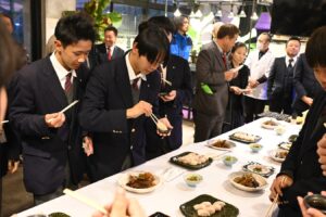 最後に記念写真を撮影し、遊食房屋様のご協力によるタマカイの試食会と歓談の時間が設けられました。初めて口にするタマカイの味に、生徒・教職員からは驚きと感動の声が上がりました。