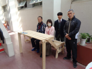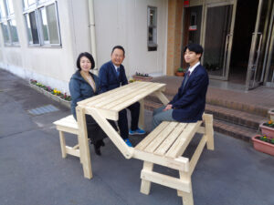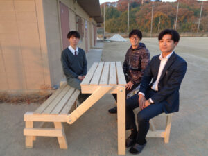 このベンチは机にも変形させることができ、設計から製作まで生徒たちが行いました。