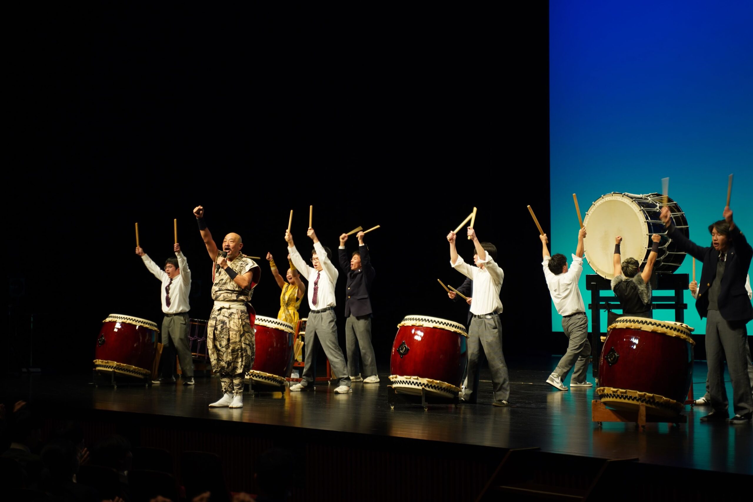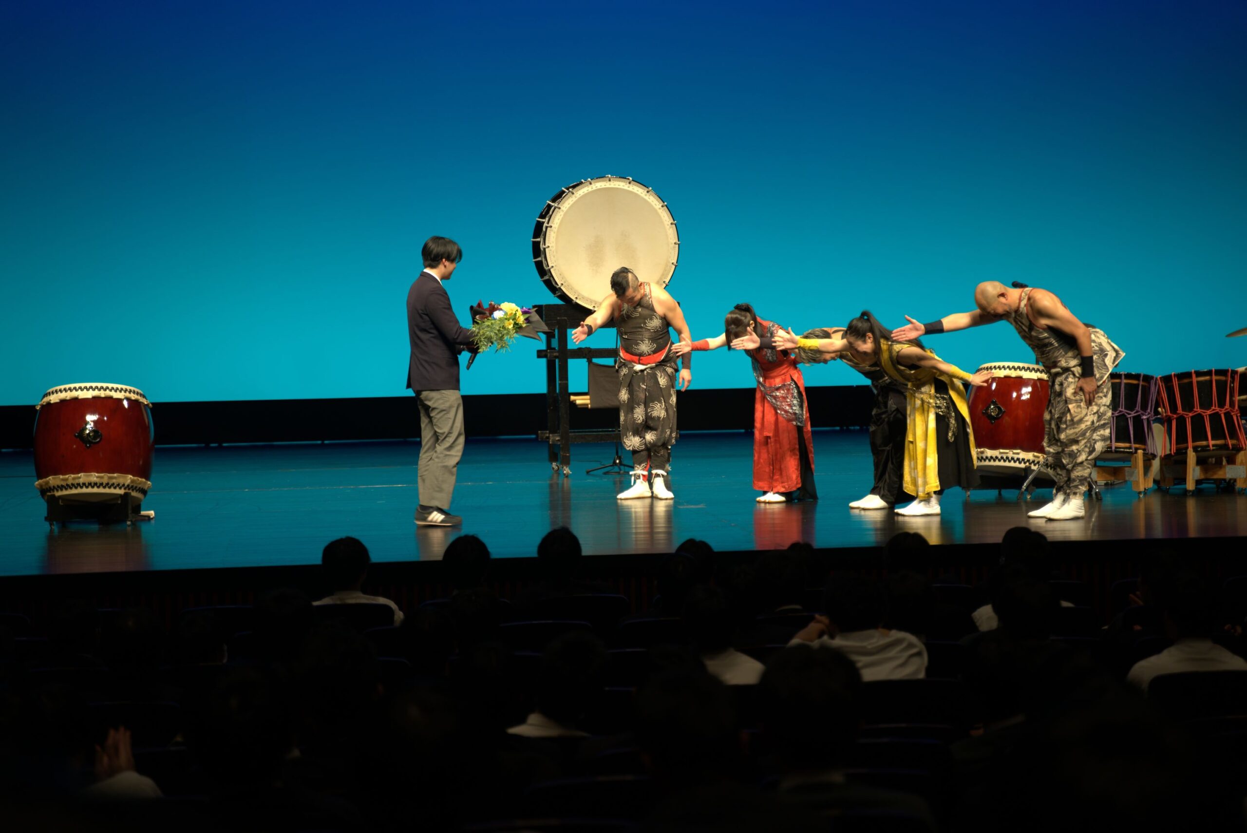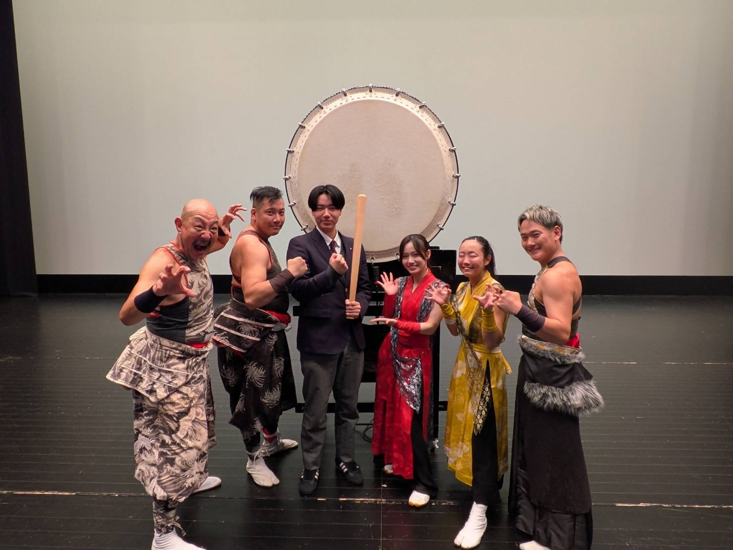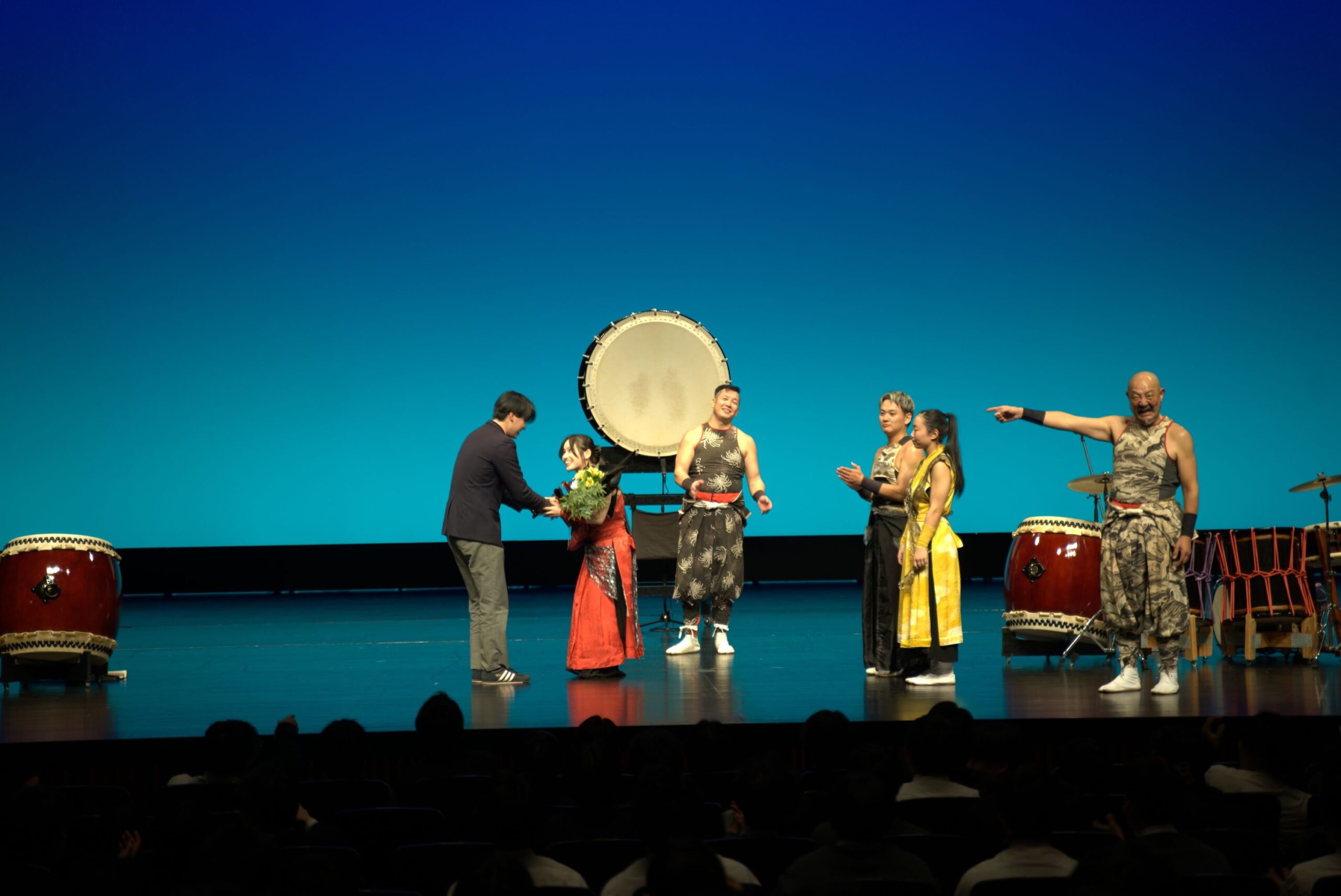 舞台に立ち、演者の指導を受けながら太鼓を打つことで、音の迫力やリズムの難しさを体感し、鑑賞するだけでは得られない貴重な学びとなりました。さらに、サプライズとして教員がステージに登場し、太鼓演奏を体験する場面もあり、会場は大きな拍手と笑顔に包まれました。