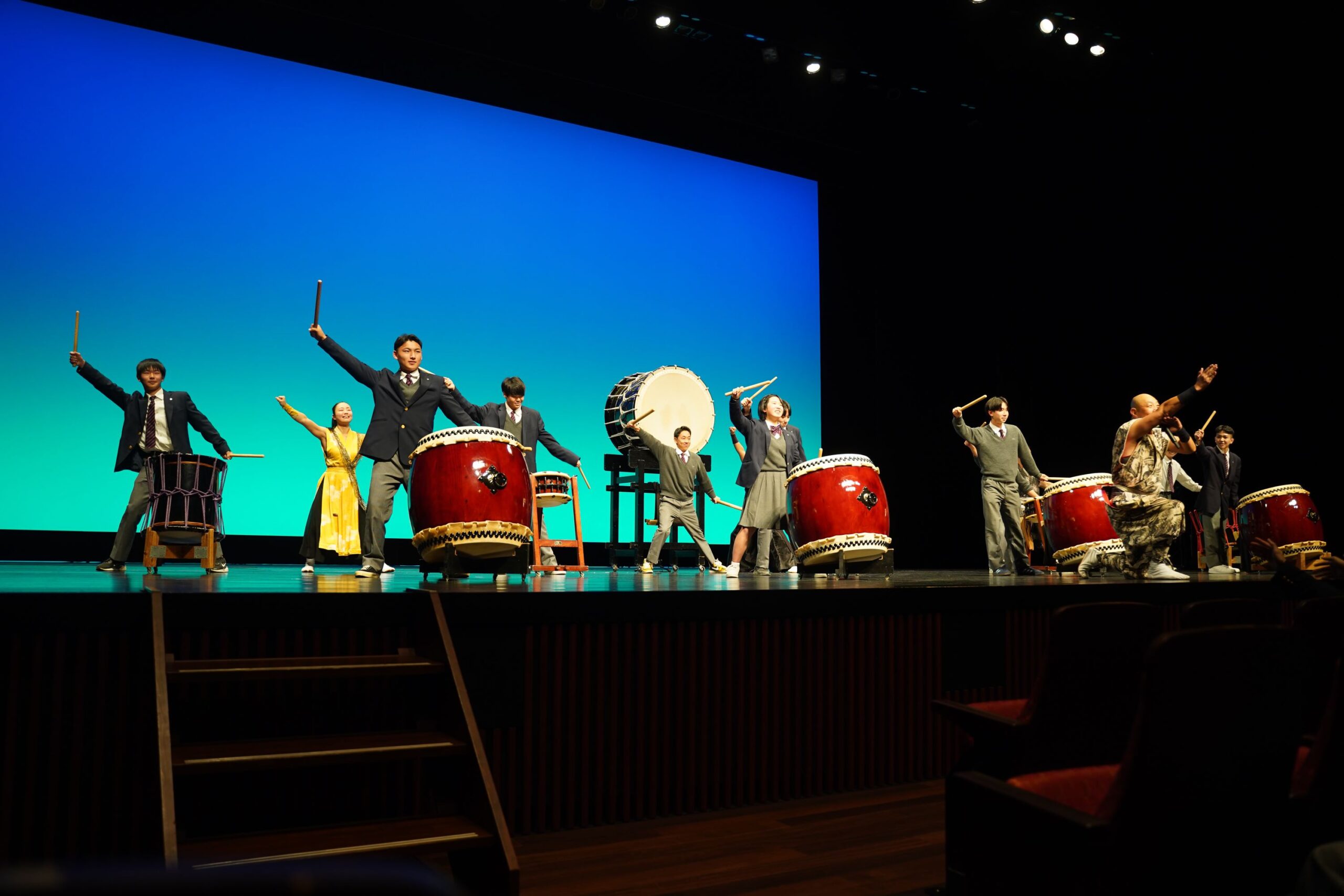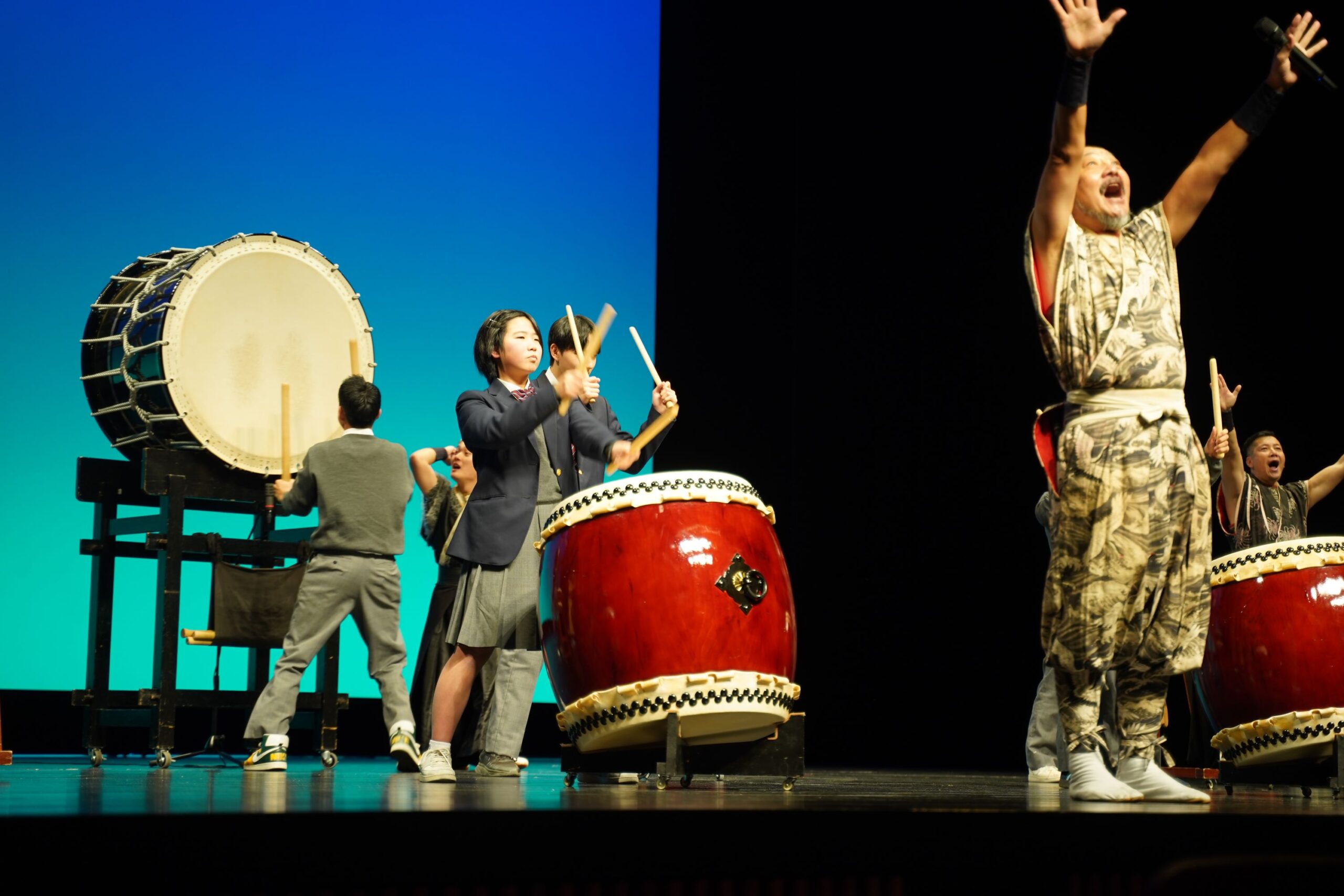 公演の途中には、生徒が実際に太鼓を打つ体験の時間も設けられました。